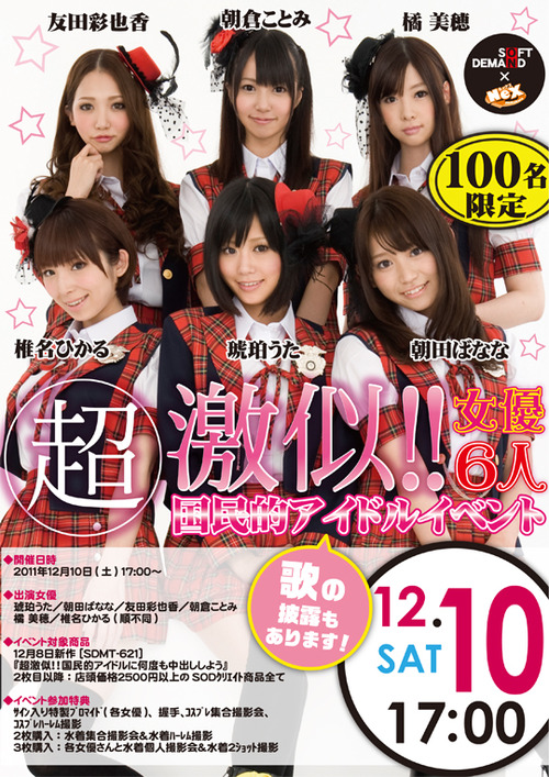 對AKB48稍有認識的話就會發覺這次活動的驚人之處。AKB48的AKB其實就是秋葉原的英文拼音「AKIBA」的意思,可見秋葉原對AKB48而言相當於團隊的命脈所在。讓以AV女優組成的仿AKB明星臉團體在這裡活動,簡直就是太歲頭上動土的踢館行為。海報上的宣傳標語「這將是我們六人最後一次公開露臉」,想必多少是為了避免被AKB粉絲抗議而祭出的苦肉計吧?不過儘管之後不會有公開活動,SOD好不容易讓這六位「國民偶像」齊聚一堂,接下來有關她們的片單當然還是滿滿滿滿滿的啦。接下來還有什麼好料就請各位繼續鎖定本站囉!