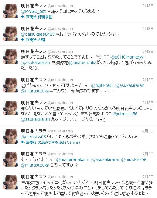 客觀地說,她不僅外型條件不差,產能也相當充足,儘管短期沒有走紅將來也應該有不錯的前景,但卻因為這次的事件,弄得部落格沒了推特也關了,據綺羅本人的講法,就像「逃亡了一樣」。三浦涼花登錄在DMM的十一部作品中就有三部是在Prestige發行的,要是她還打算繼續在業界打拼,實在沒有什麼理由去找Prestige專屬女優的麻煩才是,更何況,對象還是Prestige的首席專屬明日花綺羅!...除非,雙方鬧出了什麼不愉快。