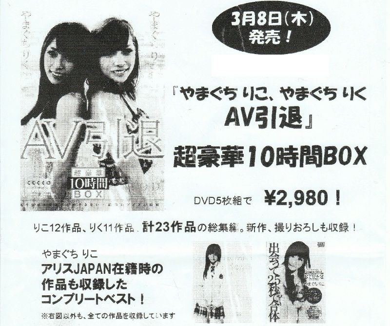 OK,終於要來聊聊這對震撼2010、2011年AV界的美人姐妹花,山口里子(やまぐちりこ)、山口里紅(やまぐちりく)的同時引退作了。第一手消息雖然放得不算慢,但出來的卻是一張黑白影印的掃圖,加上封面照還是用兩人以前合拍的舊照,所以訊息剛出來就倍受質疑,筆者因為臨時沒辦法找人到店面確認,也是看到Amazon放出預定消息才敢放聲宣揚這支作品的存在。