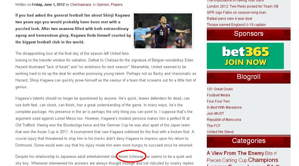 說到日本國腳與AV女優的緋聞事件,偷人小弟在下我當年還不懂事時,也曾經誤信過偷拍片網站的口號噱頭,把模模糊糊的針孔影片拿來大書特書。不過這次的緋聞規模可就明顯不一樣啦,畢竟連知名的三星級歐美運動系新聞部落格「Stretty News」都把這樁情事刊出來,更讓各大八卦網站為之瘋狂。