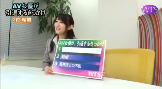 第二名的理由是「結婚」。各位經驗老到的痴漢同胞應該知道,在日本AV女優承受的倫理壓力相當沈重,要和愛人共築甜蜜小窩只能說談何容易。當然,倘若成真的話這真是一樁美事,應當獻上最深的祝福才是。結果西野翔看到這項目劈頭就爆: