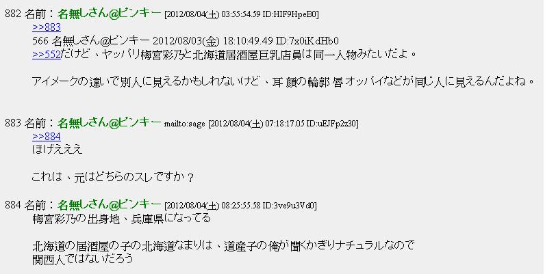 順帶一提,2ch上同個討論區也有人提出相反意見,表示椎名理紗講起話來是道地的北海道腔,與梅宮彩乃「關西兵庫縣人」的設定互相矛盾。還有個自稱認識椎名理紗的網路鄉民直稱「她就是川崎Proportion的肥皂浴賣春妹An嘛」。看來這起分身疑雲應該還有得燒,要關注最新情報就請隨時鎖定HiLive本單元囉!