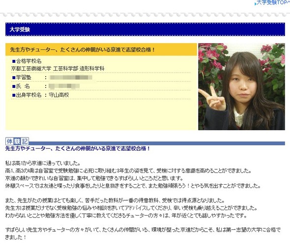回歸正題。這張截圖本身的存在已經過筆者確認無誤,位址是http://www.kyoshin.co.jp/taikenki/exp_s_289.html。由於是補習班的網頁,為了避嫌隨時有可能遭到刪除就是了。除了分髮的方向略有不同之外,從那個下垂的眼角、稍扁的鼻子和法令線等幾個特徵來看,這位考上京都工藝纖維大學的學生妹的確與笹木晴有幾分神似,甚至有日本網友認為,「倘若她們是不同人的話,像成這樣可是會鬧上法院的」。