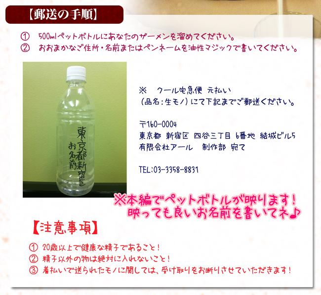 那麼,之所以要在瓶子上註明自己的住處與名字的理由是?據製作單位表示,為了證明作品中使用的精液是來自粉絲應徵寄送的純正菁華,拍攝時會直接讓粉絲寄送的瓶子原裝登場。所以囉,事先在瓶子上簽好名,片子拍好上市的時候才能拿來和朋友炫耀囉!