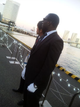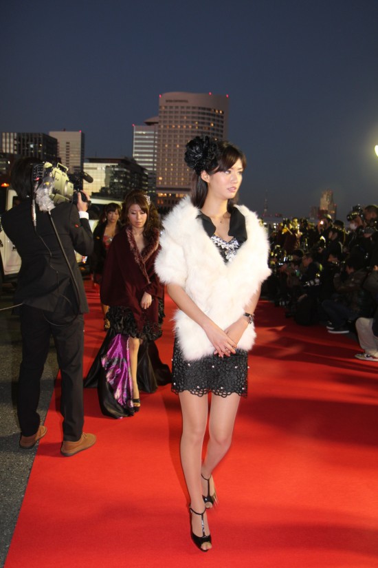 12月13日下午4點,東京灣的日出碼頭已經聚集人群,豪華郵輪前已經鋪了長長的紅毯,周圍則站著身著黑色西裝的黑人保鑣。AV女優們在這裡下車,讓大家拍照,每一位女優都像好萊塢的大牌女星一樣閃亮動人呢~