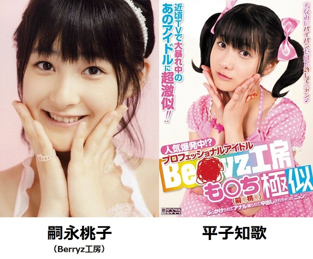 照片上這位女優,真的跟怪妞卡莉本人超級超級像,相信一半以上的人看到都會以為怪妞卡莉轉行拍AV囉!不過有人說是前田陽菜扮的啦~另外還有和Berryz工房・嗣永桃子超像的平子知歌等女優。