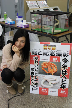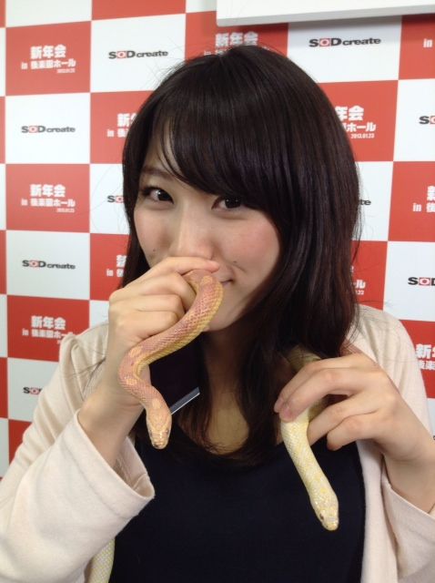 「不知道為什麼會場有蛇,就一起拍了紀念照。雖然有點害怕,不過我想著巳年也要努力工作,就卯足了勁。幼稚園的時候也有把大蛇纏在脖子上過,這是繼那次以來第二次把蛇纏在脖子上呢!我還親了牠(笑)!」