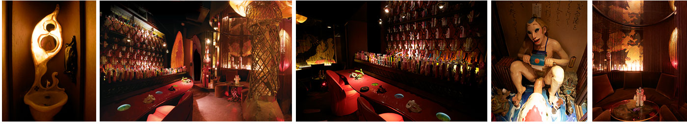 --還有,店裡也非常有特色。出入口和桌子的基座都以女性性器的模樣為設計,還有四周也裝飾著巨大自慰棒的雕像等等,恐怕這也是只有以情趣商品為主題的酒吧,才能看到的裝潢吧。然後,復古風的裝飾品和琥珀色的照明,也讓整個店裡洋溢著前衛、新潮的氛圍。
