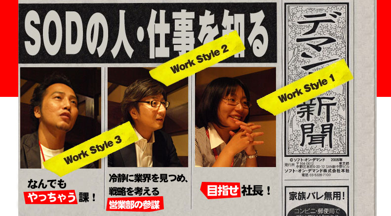 大家都知道SOD是間在企劃、行銷方面非常強大的公司,常常看到很多奇奇怪怪的企劃都是SOD的傑作,不管是魔術鏡MM號、還是女子社員企劃等,都是他們讓人讚不絕口的系列。也因此讓蠻多人都好奇SOD社揪竟是什麼樣的公司,平時社員不會都在亂交吧(驚)!不過別想太多,雖然出了一堆練七八糟的東西,SOD還是一間很正經的公司,每一個社員每天都很正常的上班、辦公,各部門也都很認真的開會、各司其職。