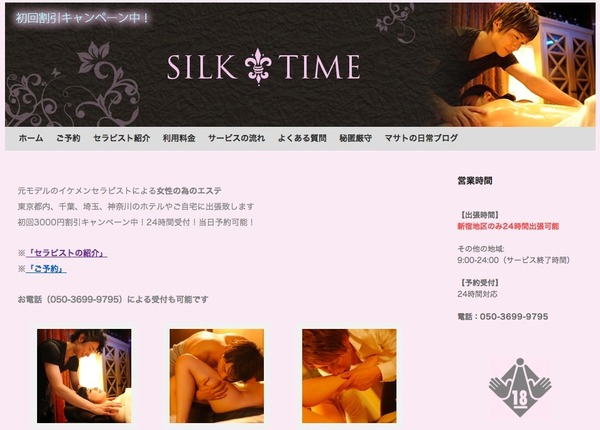 而用了照片的是這個網站:女性美容室「SILK TIME」,他們主打美型男按摩師外送服務,這些按摩師還都當過模特兒呢!簡直太過激了~雖然沒有寫出來,不過這120%是色情服務囉!日本這種八大行業的廣告實在是太明目張膽了,尤其像是什麼風俗、酒店等等,就算是在網路上找也很容易就能找到,不像台灣其實這方面被盯得很緊,一定要精通門路的人才會知道(或者說千瀨太笨了?)。不過客倌您看看,網站上這照片不都是SILK LABO的男優嘛!?難道真的可以見到夢中情人男優?