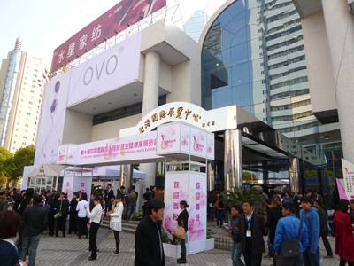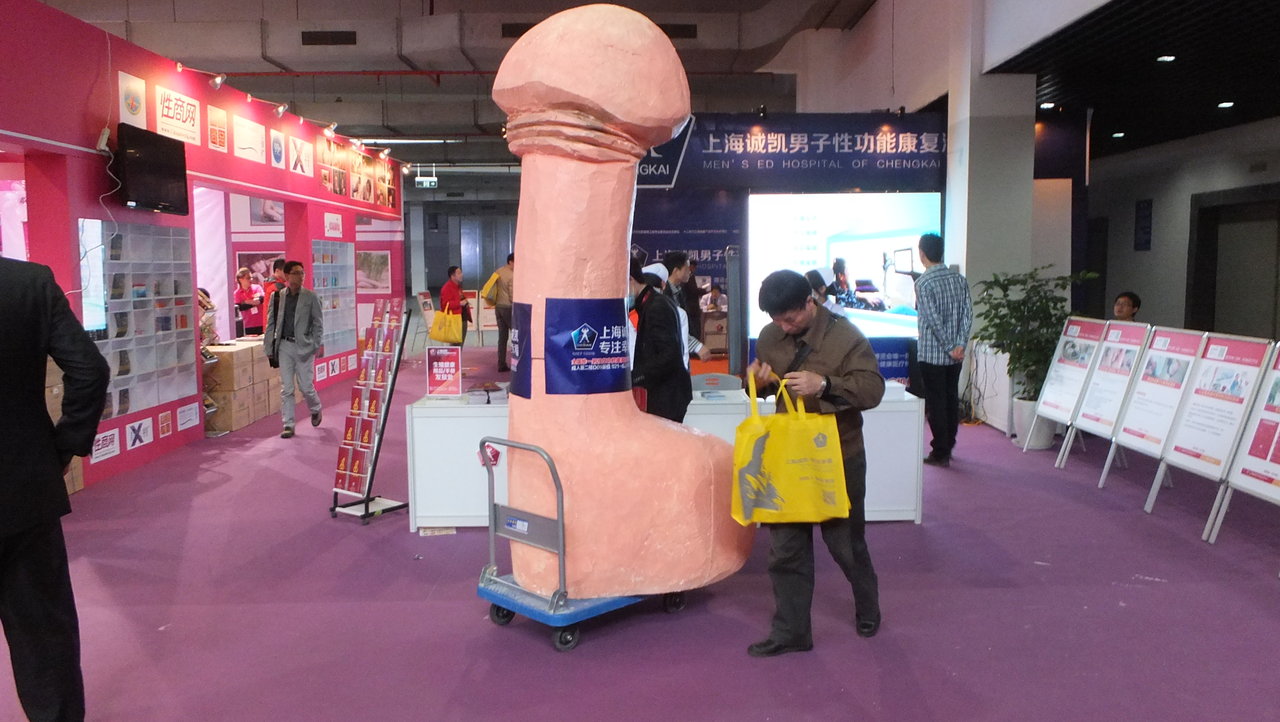 上海成人展的主辦場地「上海國際展覽中心」平常就會舉辦不少大型展覽,規模應該和台灣的世貿中心差不多,建築物外面掛著巨大的按摩棒廣告,視覺震撼力十足,不知道對於上海的民眾們會不會太刺激囉?