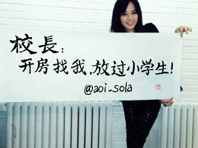 這…難道蒼井空(蒼井そら)和水咲蘿拉(水咲ローラ,原名瀧澤蘿拉)為了全大陸的小學女生,要捨身救世嗎?尤其大陸的媒體看到這些照片,還狠狠地批判蒼井空利用這樣的社會事件炒作自己,根本沒有職業道德。不過蒼井空本人倒是一頭霧水搞不清楚狀況。這張照片一夕之間就在網路上大肆流傳,政府相關的媒體清一色都針對蒼井空狠狠的評論了一番,甚至還表示蒼井空上傳照片的用意,大概就是為了商業目的。不過在那之後才發現,這張照片根本就是合成照,發現自己搞錯的陸媒環球時報在不久之後,就以迅雷不及掩耳的速度刪掉了有關這張照片的報導。