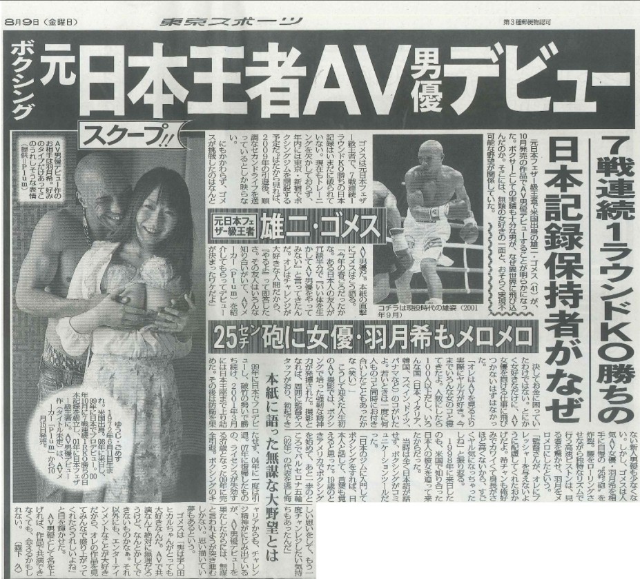 今天要帶大家認識的不是新人AV女優,而是一位剛入行的AV男優啦!不過這位男優倒是大有來頭,因為他直到2008年都還是日本的拳王,可能有捧油已經知道是誰囉~他就是雄二・Gomez(雄二・ゴメス)。身高雖然只有165公分,但是看到他全身結實的肌肉、出拳的強勁力道,就能讓人了解這位拳王不是泛泛之輩。他曾經創下日本拳擊史上連續七場羽量級賽事中,都在「一回合內KO對手」的紀錄。而在2008年雄二・Gomez以37歲之齡引退,如今他要在AV界"東山再起"。