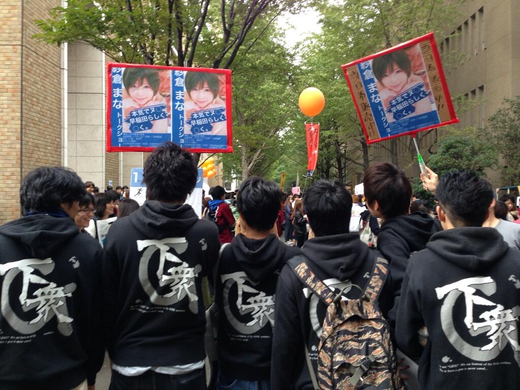 不只有早大,東京大學(東大)在去年的校慶五月祭時也邀請了AV女優成瀨心美當特別來賓,看到夜夜陪伴自己的偶像站在講台上,相信學生們一個個應該都樂不思蜀囉!這次的早大祭時,校園內還可以看到高舉紗倉真菜海報的學生們,即使是現在風氣這麼開放的大學校園中,恐怕也很難看到這樣的畫面,只能給早稻田一個讚啦!