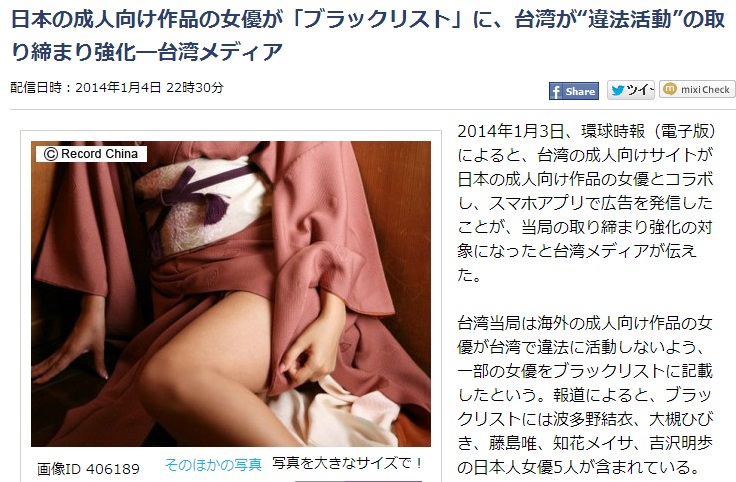 眾所皆知,台灣政府做事就跟撥接網路一樣,類格很嚴重又常常只是隔靴搔癢,現在又在國際上鬧了個大笑話。這個消息鬧了一陣子後也不復見媒體重提,結果到了一月日本正過年時,台灣媒體又大肆報導「移民署將五位AV女優列為限制出入境黑名單」,其中被列入名單中的有波多野結衣、吉澤明步、羽田愛(羽田あい)、大槻響(大槻ひびき)、藤嶋唯、知花梅莎(知花メイサ),都是近年來台參與國際成人展、各家網站宣傳站台的女優,不難猜想這些名單都是參考新聞報導擬定出的名單。只是令人啼笑皆非的是,知花梅莎在該次活動後不久就沒有攝影,從業界消失了,事到如今還把她列入黑名單更凸顯出台灣人不求甚解的做事態度。