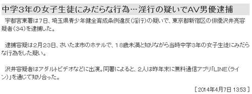 這次的澤井亮 “約未成年打砲” 真的不是什麼片商的特殊企劃,不但已違反了日本的「青少年健全育成條例」,於是他就在4月7日在東京新宿被逮捕了,當天更打響了他的知名度,也上了新聞搜尋前幾名…連PTT網友忍不住砲轟「果然還是越青春的肉體越好」、「都吃那麼多了還不夠」(這下你不只是 絕對不會射的男人,根本是"分不出來未成年"的男人啊!)