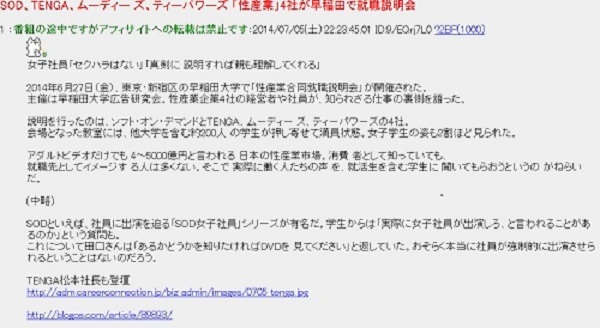 這次SOD、TENGA等四家知名的廠商入侵了東京名校早稻田大學(註1)徵材開辦就職說明會!日本2CH網站在2014年6月27日出現了一篇報導,是由早稻田大學主辦的“性產業聯合就職說明會”在早稻田新宿校區開放徵材,由四家知名的AV片片商在說明會上做了徵AV女優的說明,估計大約有200多名學生參加此次徵材說明會,女生大約佔20%!(謎之音:哪天會來台灣最高學府台大開說明會嗎?!)