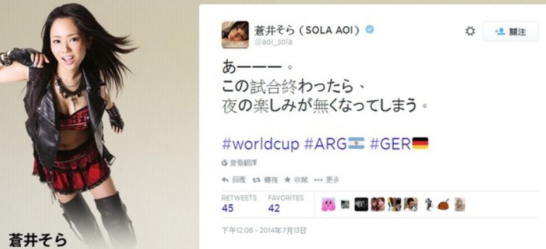 隨著世足的落幕,好久不見的蒼井空在自己的推特上說: