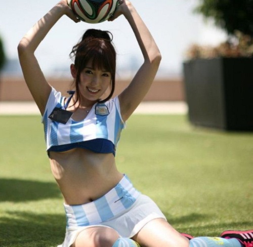 接下來我們來看看黑暗林志玲女神波多野結衣(はたの ゆい)怎麼瘋世足滴~結衣女神穿著改良式的阿根廷球衣露出美麗的腰線,感覺真的好健康好美麗~尤其是她那甜美的笑容,me-me女神團整團都穿著改良式球衣,粉絲們到底該選哪一個好勒?