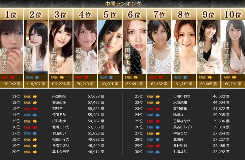 看完了最新名單前10名,前三名的紗倉真菜、有村千佳、上原亞衣的票數真是壓倒性的勝利呢,這次要找出100名女優的資料真的需要花個幾天時間呀,這次的人氣投票感覺超熱烈呢!