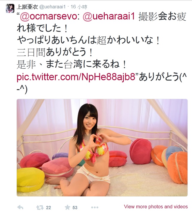 (隔天上原亞衣的 twitter 告訴大家來台灣她有多開心)