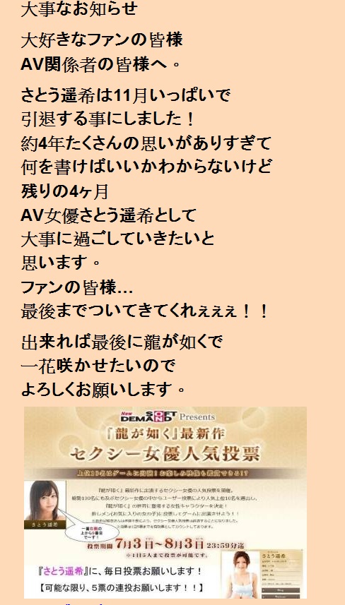 大家請準備好衛生紙,AV界的噴水女王佐藤遙希(さとう遥希),已經在twitter上宣佈、將會在11月的時候引退,結束自己的AV生涯!