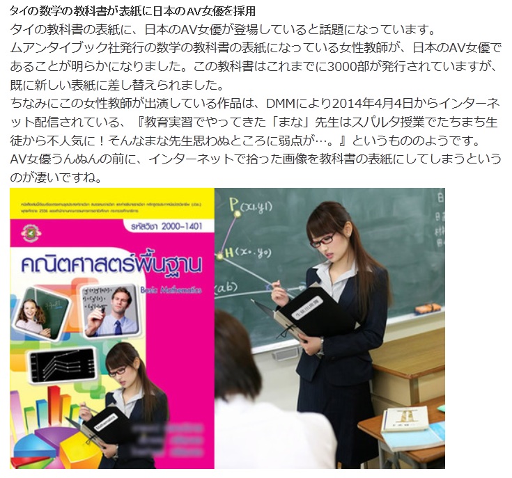 Google大神是很好用的搜尋引擎,不管是用來查資料、寫報告都可以找到需要的東西!但泰國教科書出版商,隨手Google一下找尋適合的教科書封面照片時,竟然把愛情動作片內容誤認為教材,看到穿套裝在教室上課的女老師就拿來當封面,該糊塗的出版商就把AV女優當成女教師,並開開心心的印在泰國學生的數學課本的封面中,還發給各了各大學校!被泰國民族報報導出來!