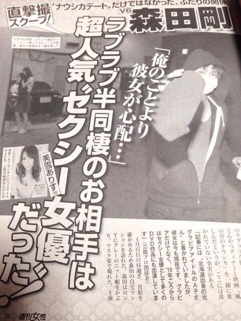 今年四月才傳出的與E奶AV女優美雪愛麗絲甜蜜半同居,當時森田剛帶著美雪愛麗絲出門遛狗,返家時剛好被媒體跟拍,當時他阻擋鏡頭拍攝,為掩護女友離開,還主動停下受訪說: