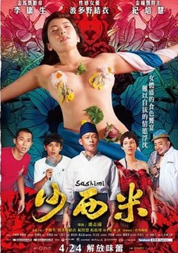 即將在4/24上檔的國片『沙西米』,因為波多野結衣一張近裸體的(註)『女體盛』(女体盛り)海報遭到台灣電影禁上!由於女體盛是非常辛苦的,因劇情中的需要,波多野結衣上半身赤裸!很敬業的躺了4小時,並且盡量不動的保持同一個姿勢,拍完這段身上充滿了壽司的腥味真的很不舒服,AV女優是很耐操的,敬業的撐4個小時躺著不動拍電影。