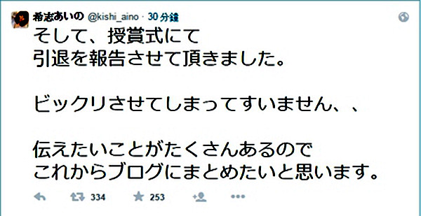 特別賞:希志愛野(希志あいの)(@kishi_aino )「將會在今年引退」