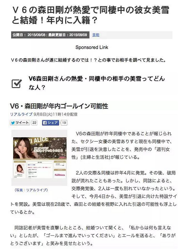 《週刊女性》再次爆料!美雪愛麗絲(美雪ありす)即將要成為森田剛的妻子?!李組長眉頭一皺,發現案情並不單純呀~