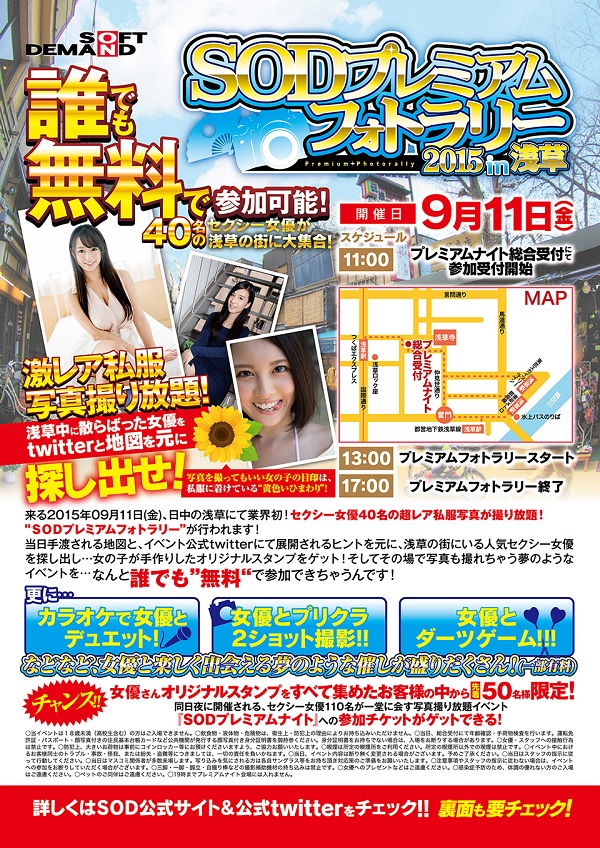 這次SOD玩有夠大的,動員了百位人氣女優讓你補獲,整個活動就像個女優樂園,只要在活動時間上午在指定時間抵達淺草會場報名就可以免費參加SOD寫真拉力賽in淺草『SODプレミアムナイトin浅草』。