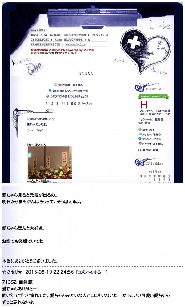 她的最後一則網誌雖然一直停留在2008年12月5日,再也沒有更新過,但這篇網誌累積了70500則粉絲對她的留言與不捨,在中居正廣代告知大家,小愛的父母已經無力在經營她的部落格後,留言的粉絲變為71300則,在關閉前粉絲留下了最後的留言給小愛: