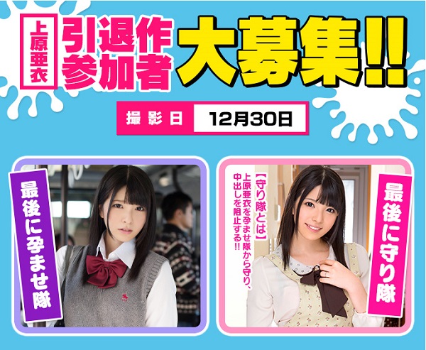 片商一向是比動作快的,「本中」立馬在推特上PO出這部引退作品的相關資訊,開始招募『愛上原』『超持久』『超有幹勁』男人中的男人參與上原亞衣的引退作品,預計12月30日開拍,只要符合下列條件『年滿20歲』『願意在作品中露臉』『沒有性病』就可以上官網報名,片商為了保護AV女優,在作品開拍前可是會請報名者進行性病檢查,確定真的沒有染病才可以參與演出哦。