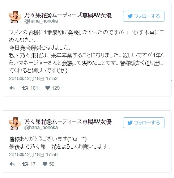 去年年底有不少女神都發表了引退宣言,一個一個離開了AV界,時間過的超快,該來的還是要來,年底宣告引退的乃乃果花(乃々果花)於推特中發表,將會在2016/4/13發行引退作品「引退~花の思い出シチュエーションを今再び~」,這則消息讓粉絲原本就破裂的心再次碎到完全補不起來了。