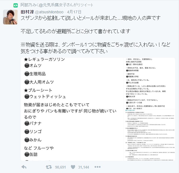 除了AV女優外,《男女糾察隊》的小淳也對熊本縣民的祝福打氣語,另一個就是AV女優也喜歡的熊本吉祥物「熊本熊」從地震開始就銷聲匿跡引起粉絲關切,只希望熊本熊快點出現,在熊本所有的AV女優及民眾一切平安。HiLive enjoy your life!bye~bye。