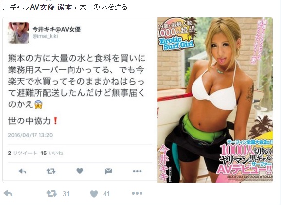 最後是AV中號稱是全國衝浪大會第二名的黑辣妹AV女優今井奇奇(今井キキ),直接發揮愛心在樂天買水送到災區,雖然說衝浪大會第二名的頭銜應該是企劃單位唬爛的手法,但她的愛心絕對是真的!一堆粉絲讚揚今井奇奇真的是很有愛的AV女優,也表達要多支持購買她的作品。