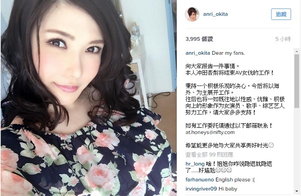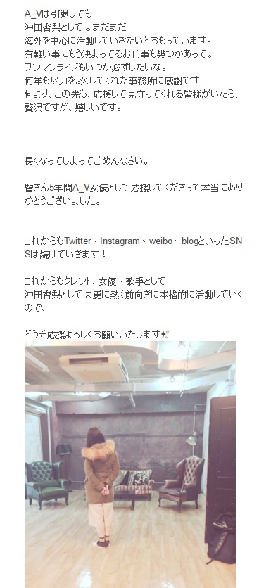 這次無預警宣布引退,原因是想要拓展海外演藝事業朝著全方位的藝人之路邁進,即使知道這條路非常辛苦,沖田杏梨說著她會更加的努力,也謝謝一路上支持她的粉絲與經紀公司,引退的消息很快的在Blog、Twitter、Instagram發表,AV天后一個個引退的消息實在太令人感傷了(泣..)