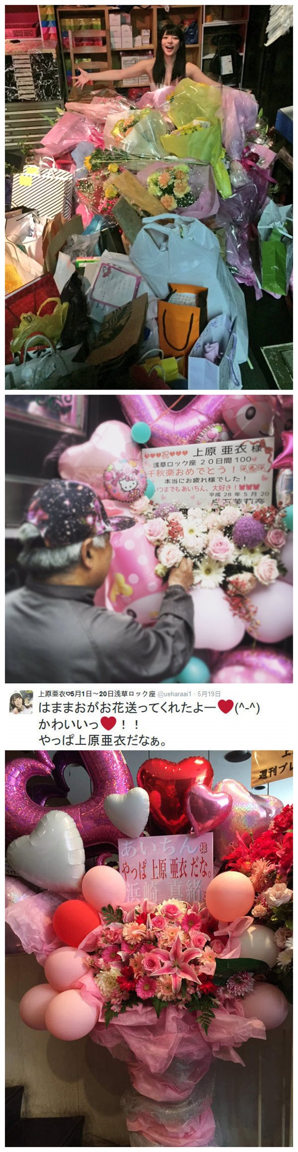 「淺草ROCKZA」表演當天,現場來了許多粉絲送上鮮花、禮物,表演完成後她在在推特上傳照片向粉絲道謝,而喜愛她的網友也大量湧入推特留下對她的祝福,當天關鍵字『#上原亞衣最後の日』更登上搜尋排行榜前3名,可以說是推特上的洗版日了呀,我們也見證了上原亞衣的在AV界的天后地位。