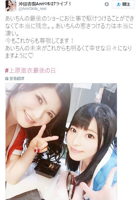 表演完畢就不會發表任何新作品、不會再公開亮相,紛紛在推特上以關鍵字「#上原亜衣最後の日」 來紀念上原亞衣正式引退。
