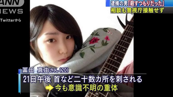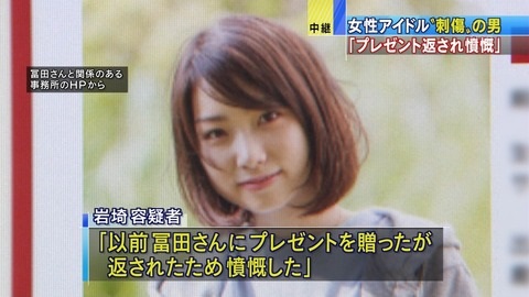 震驚日本社會日本20歲大學生歌手富田真由(冨田真由),21日在東京小金井市開小型演唱時遭男粉絲狂刺20多刀,日本警方立刻在犯案現場逮捕了27歲的無業男子「岩埼友宏」。男子坦承自己曾是富田真由的粉絲。行凶的原因是他送禮給冨田真由卻被退回,於是憤而行凶。岩崎友宏當日身穿藍色T恤,在車上神態自若,臉上無表情。