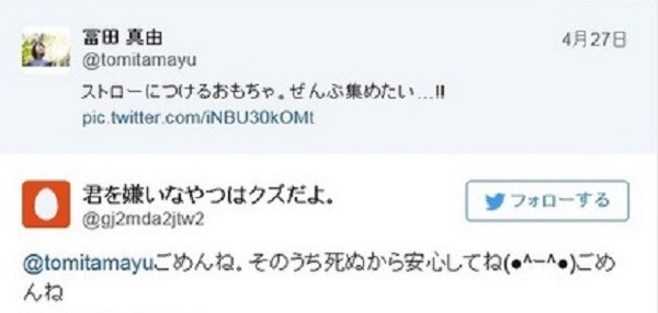 (變態男曾在富田真由推特寫下「抱歉,不久妳就會死了,放心吧!」)