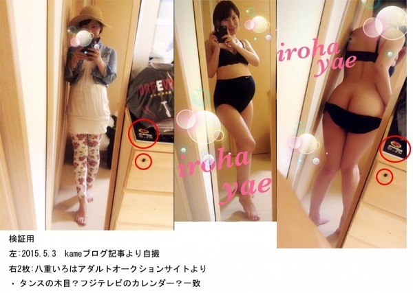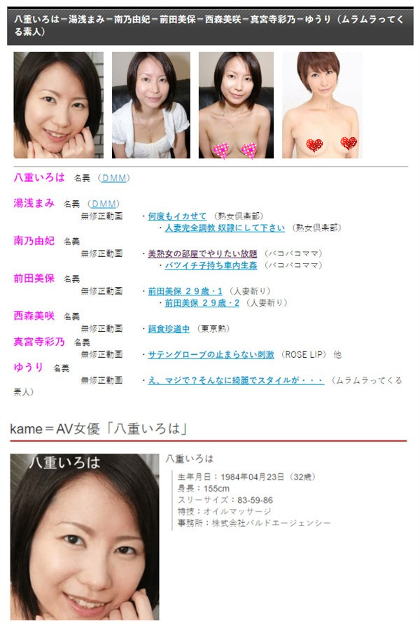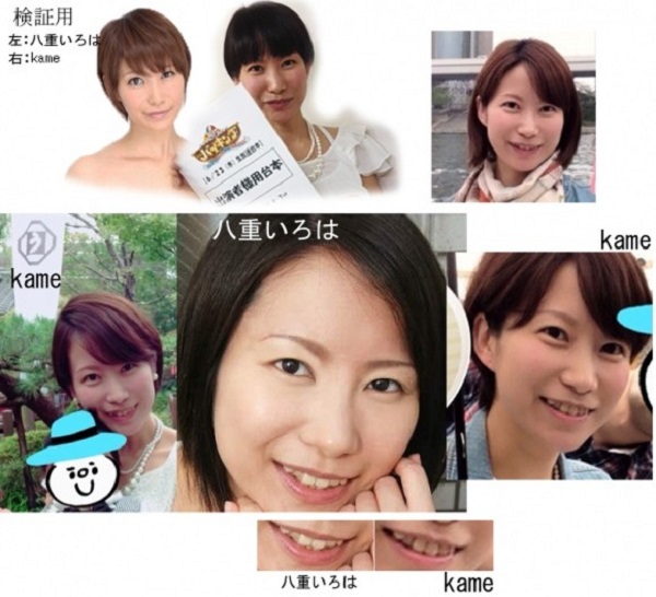 只能佩服鄉民實在太厲害了,舉出很多照片證明Kame有拍過AV的事,照片中可以看到從髮型、耳朵、牙齒、微笑的模樣等等特徵都跟AV女優八重伊呂波(八重いろは)相似度非常高。