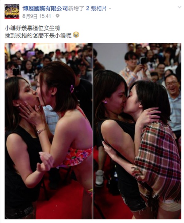 展場中有個活動是抽到戒指就可以跟AV女優親親chu一下的遊戲,沒想到....抽到戒指的居然是個女生呀!!現場男粉絲都超羨慕的...