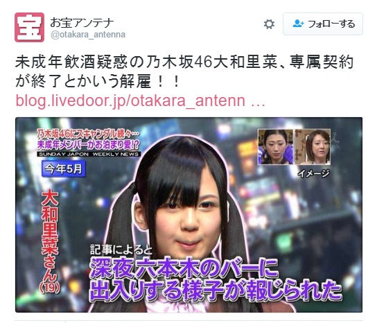 大和里菜本身是《乃木坂46》第一代成員,在2014年被《週刊文春》拍到多次在六本木的酒吧出沒,被懷疑未成年飲酒。(日本未成年飲酒是很嚴重的事)