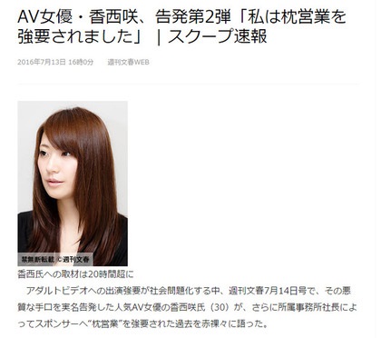 後來香西咲跳出來接受日本《週刊文春》的採訪,控訴 40 歲的「At Honeys」社長青木亮對她威脅、洗腦和逼陪睡。2011 年出道的香西咲表示一開始只是想要當寫真女星,但是在簽約之後卻被公司威脅和洗腦的方式而變成了 AV 女優,甚至在公司為了進軍中國大陸的情況之下被逼著要陪睡富商以及各式各樣的陪睡換取公司利益,而這件事也在當初香西咲合約到期之後陸續爆發出來,又是一樁AV界的醜聞啊!