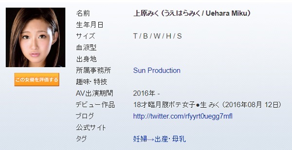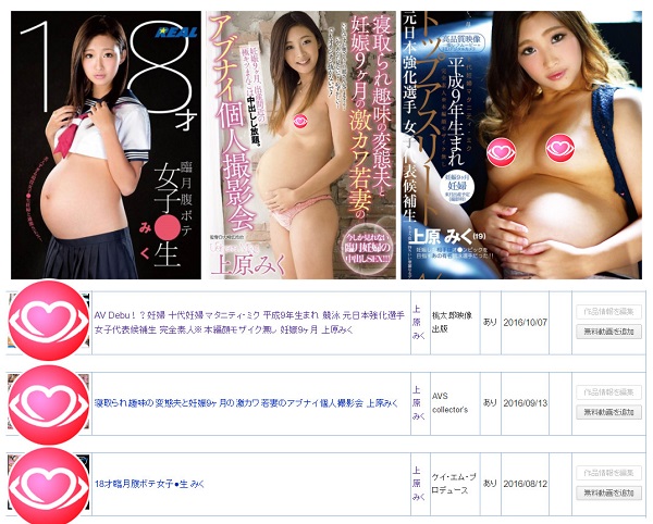 可愛的上原未來有著甜美可人的臉蛋+158公分的小隻馬身材,原本應該散發18歲的青春洋溢卻弄到穿著製服大著肚子出現在AV封面上,真的是很詭異的氛圍。她在懷孕7個月時下海拍AV,而且不是拍一片紀念而已,是一路拍到『臨盆』連續發行了幾片,口味超鹹濕還有6P讓人不禁替她捏把冷汗(啊肚子要不要緊啊…)。