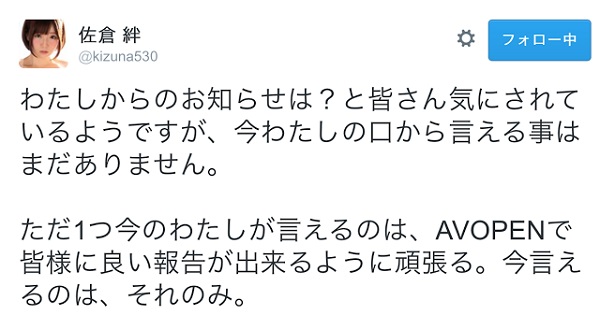驚訝的還不只如此,在2016/10/19同一天『佐倉絆』也在twitter上宣布『有重大的事情要在AV Open後告訴大家』,通常看到這樣的消息大家心裡大多能猜到女優不是宣布引退就是身體出了狀況的消息….
