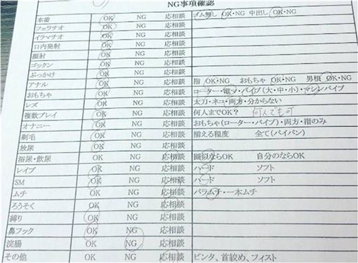 我們可以看到這份『演出面試表』片商列了超過30個演出的選項,上面寫出各種由輕到重口味的愛情動作、或是高難度特技表演等項目,每個動作中有「OK」、「NG」和「面議」三種選項供選擇,同意就寫OK、不同意就打NG。真的就跟一般面試要填寫的基本資料根本一樣。