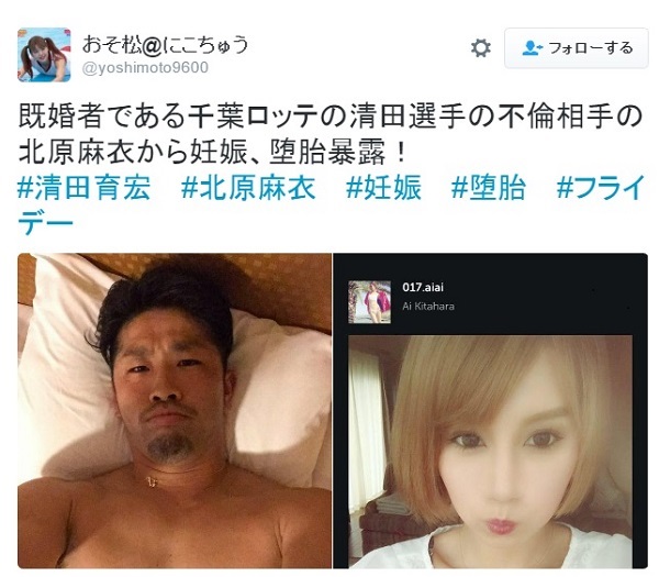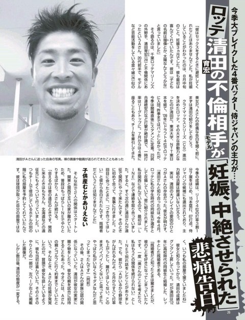 真相原來是日本媒體曾經報導過,羅德海盜隊職棒明星選手清田育宏偷情一事,當時已婚的清田育宏背著老婆與"北原麻衣"大搞不倫婚外情,不久後北原麻衣懷孕了,清田育宏在Line上要她墮胎,後來兩人談不隴宣告分手,而清田育宏婚姻也因此破滅,並在棒球界鬧出了大醜聞另眾人唾棄。